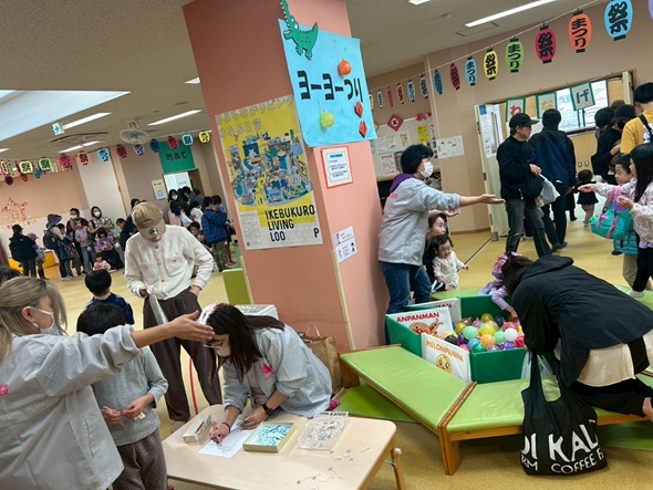 第16回「上池袋ひろばまつり」が開催されました。オープニングを飾ったのは「回遊音楽キャラバン」のバイオリンとピアノのコンサート。フランクフルト、チョコバナナ、ポップコーンなどの食べ物コーナーは、行列が出来るほどの大人気。ヨーヨー釣り、的あてなどの縁日ゲームのコーナー、新聞ゴマ、変わり絵パズルなどの手作り玩具のコーナー、CSWのガチャガチャも大賑わい。地域の人々と協力し合って開催し、楽しめるまつりとなりました。