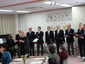 秋フェスタ オープニング DSKスクワイア 男声合唱団の皆さん 同志社大学グリークラブの皆さんで結成された合唱団です 讃美歌・慈しみ深き〜いい湯だなまで多彩な歌を楽しみました |