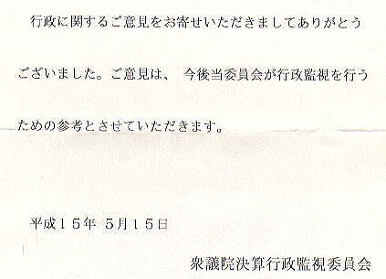 たったこれだけの返事だった。 大きな問題を提起したのに、木で鼻をくくったような言い方のお手本みたいな表現であり、これでは返事になっていない。 衆議院には行政監視する委員会が与野党議員で構成され、国民からの生の声を 「平成の目安箱」として位置づけ、改善すべきはするとの事だが、この制度はあってなきか如しだと云わざるを得ない。 |