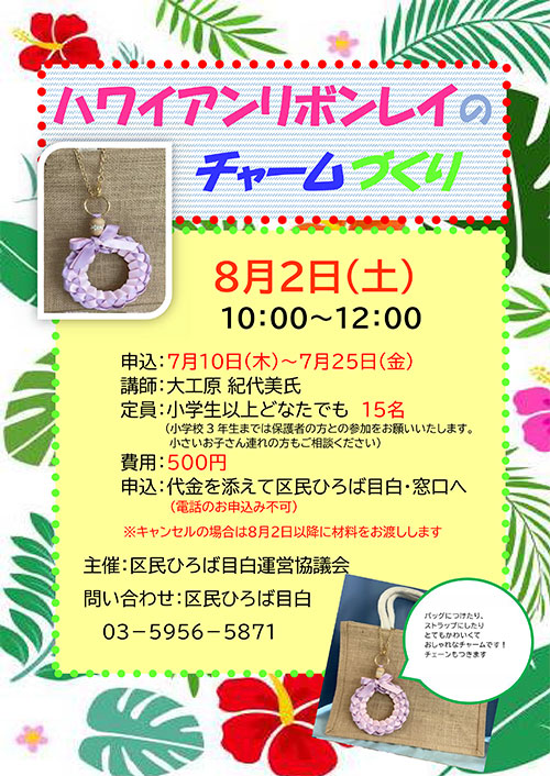 | 2025年8月02日(土) 「ハワイアンリボンレイのチャーム作り」を開催しました!(ポスター) 大工原紀代美氏のご指導により 色々な色のリボンより、参加者それぞれに好みのチャームを作りました。 初めはリボンを通すのに苦労される方もいましたが、 時間が経つにつれて慣れて来て、 終わるころには見事な作品が出来上がり、皆さん大満足でした。 |