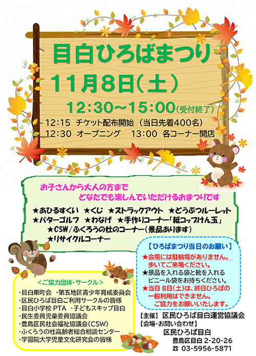 | 2025年11月08日(土) 「目白ひろばまつり」を開催しました!(ポスター) 手作りコーナーで「紙コップけん玉」を作ったり、 どうぶつルーレットでヒヤヒヤ・ドキドキ、 パターゴルフでおとなかおまけのカップイン、みんなで楽しみました。 近隣の各種団体やサークルの大勢の方にお手伝い頂きました。 |