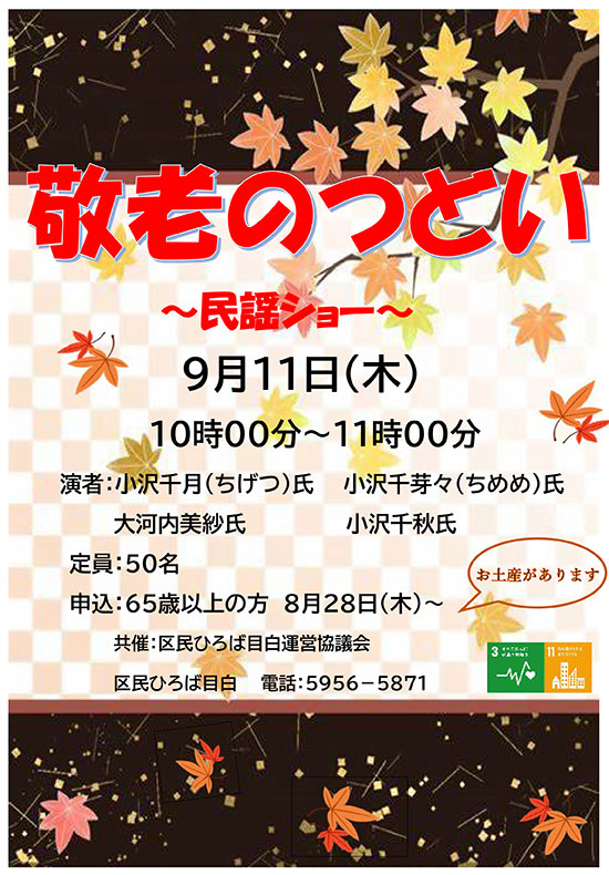 | 2025年9月11日(木) 「敬老のつどい-民謡ショー」を開催しました!(ポスター) 始めに、高際区長から敬老の日のお祝いメッセージを頂きました。 その後、小沢千月氏・小沢千芽々氏らによる 太鼓、三味線を交えた、色々な民謡と、千月氏の軽妙なトークがあり、 また、若手女性による華麗な踊りもあり、 皆さん、聞き惚れて楽しんでいました。 |