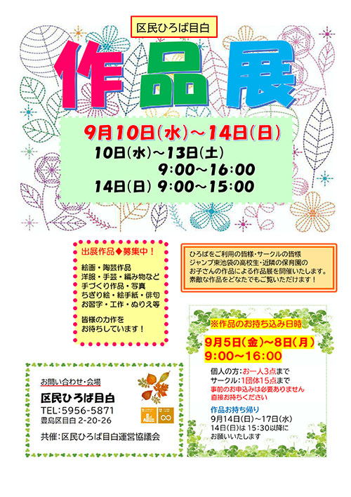 | 2025年9月10日(水)~14日(日) 「作品展」を開催しました!(ポスター) ひろばをご利用の皆様や近隣の保育園のお子さんによる、 数多くの手作りの作品が展示されました。 きもの、書道、焼き物、人形、リボンレイのチャーム、など 皆、力作ばかりで、来場者の方もしばし足を止めて、 じっくりご覧頂いていました。 |