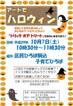 ![]() ☆ アートでハロウィン ☆ 平成29年 10月 7日(土) 主催:運営協議会 すくすく部会 |