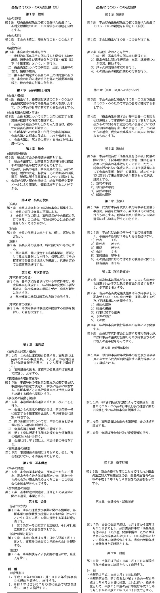 | 「交流会」では、多くの会員から「今後もOB・OGが集う場を設けてほしい」との思いが示されたと受け止めています。また、2033年には 「高畠先生 生誕100年」を迎えます。この大きな節目を含め、今後も より多くのOB・OGが集える場をつくっていくため、会運営の基となる規約を精査し、会のあり方、重要事項の議決手続きなどに関し、簡潔でより分かりやすい内容としました。 | |