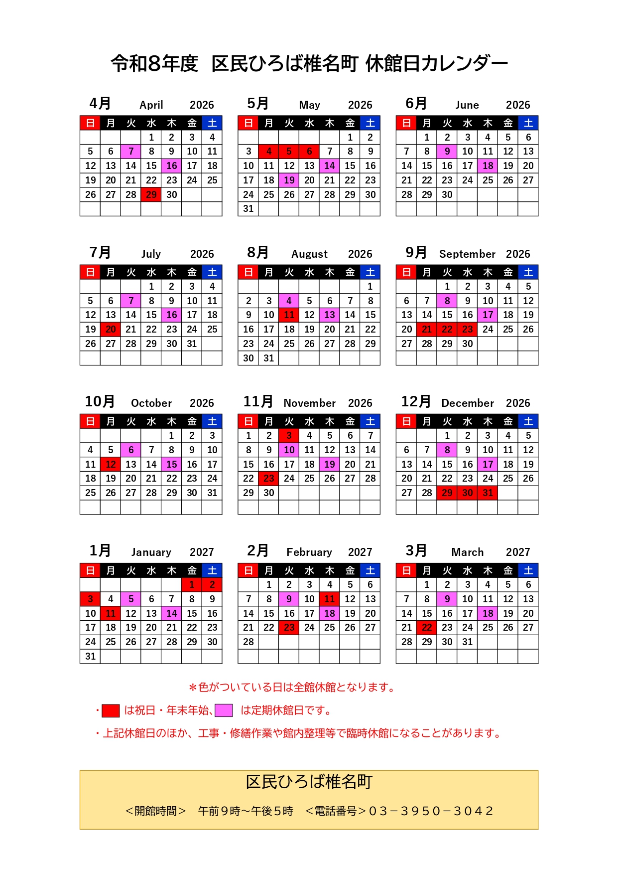 ※令和8年度から各ひろばの定期休館日が固定になります。