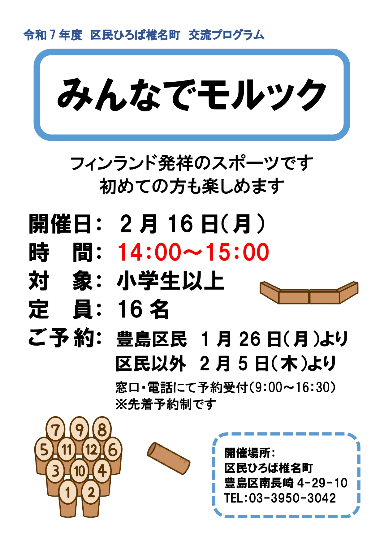 みんなでモルック ■初心者の方も大歓迎!!誰でも参加できますので、毎月一回この日は 区民ひろば椎名町でモルックで交流しましょう♪