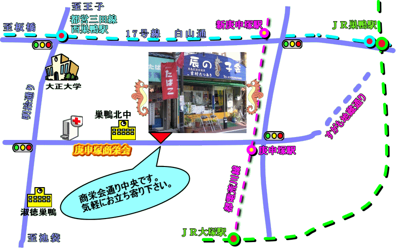 西巣鴨 庚申塚商栄会通り中央 巣鴨北中学校並び 気軽にお立ち寄り下さい。