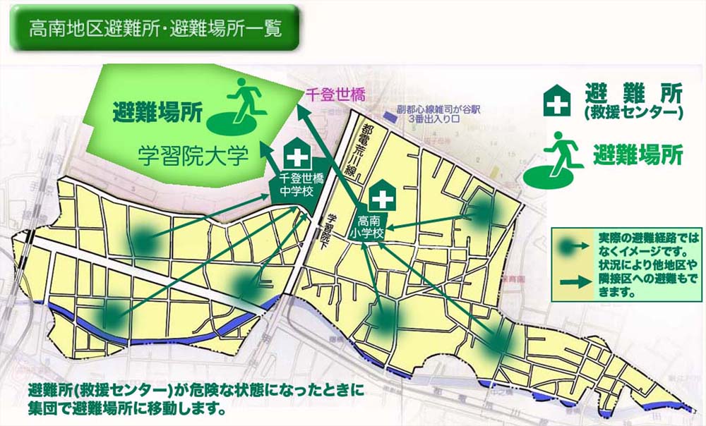 ここでは、高南地区の避難所(救援センター)と避難場所についてお知らせします。 高南地区に関わる避難所(救援センター)と避難場所の場所は下記地図に示しました。 | |||