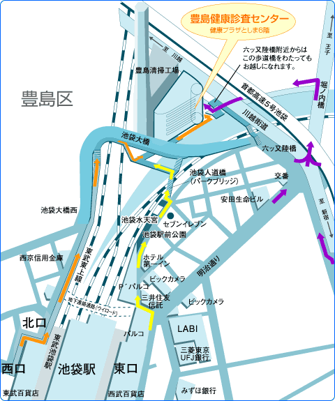 - 明治通り・春日通り・池袋大橋からは、六ッ又陸橋から同じ順路です。