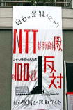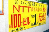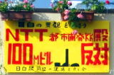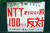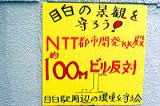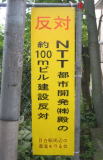 「守る会」作成の看板、のぼりでは、計画の存在を知らない方を含め、広く多くの方々の認知を高めることを目的として、「100mビル反対」と表示しています。