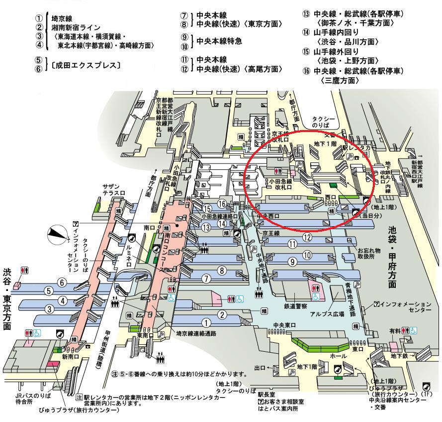 | <<大宮方面からの人>> 1.埼京線の一番後ろの車両に乗りましょう。到着は、1〜4番線のどれかです。 2.電車から降りたら、進行方向とは逆(大宮方面)の方に真っ直ぐホームを戻って下さい。ホームの端に階段があります。 3.階段を降りると直ぐに、右側に改札(中央東口)がありますが、無視してそのまま真っ直ぐ突き当たりまで進んで下さい。 突き当たりのすぐ右側が東口になります。その改札とは反対方向(突き当たりを左)に進んで下さい。西口の改札になります。 (上の地図だと、青梅地下通路と書いてある所を歩くことになります) 真っ直ぐ歩いて行き止まりになった所がアルプス広場ですが、ハイジはいません。間違っても、右へ進んではいけません。 そちらはスタジオアルタなどがある東口です。 3.改札を出ると、左側に売店があり、売店の裏側に昇りの階段があります。そこを昇れば、正面が小田急の改札口になります。 <<上野・日暮里方面からの人>> 1.山手線(内回り)渋谷・池袋方面行きの一番後ろの車両に乗りましょう。到着は、14番線です。 2.電車から降りたら、一番近い階段を下りて、右側に見えるのが西口の改札口です。 3.改札を出ると、左側に売店があり、売店の裏側に昇りの階段があります。そこを昇れば、正面が小田急の改札口になります。 | ||
