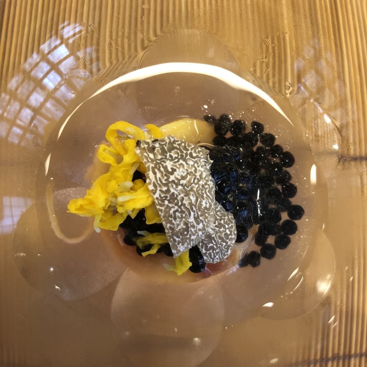 白桃に白トリュフを乗せた一品。菊の苦みがアクセントとなり風味豊かな味をお楽しみください。